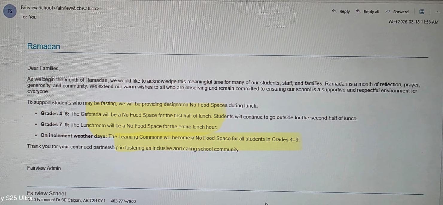 Urgent: Have you taken action? Reports from across Canada show Muslims demanding that our public schools accommodate Ramadan—seizing lunchrooms and cafeterias as “No Food Zones” for the full lunch hour (Fairvew School Calgary), as well as commandeering gymnasiums for prayer and fasting (no music permitted!) in others. Yes…you heard that right. Never mind Manitoba’s new Anti-Islamophobia Action Plan infiltrating K-12 education! Our children are being exposed to dangerous Islamic rituals and indoctrinated into radical ideologies. Are you ok with that?
